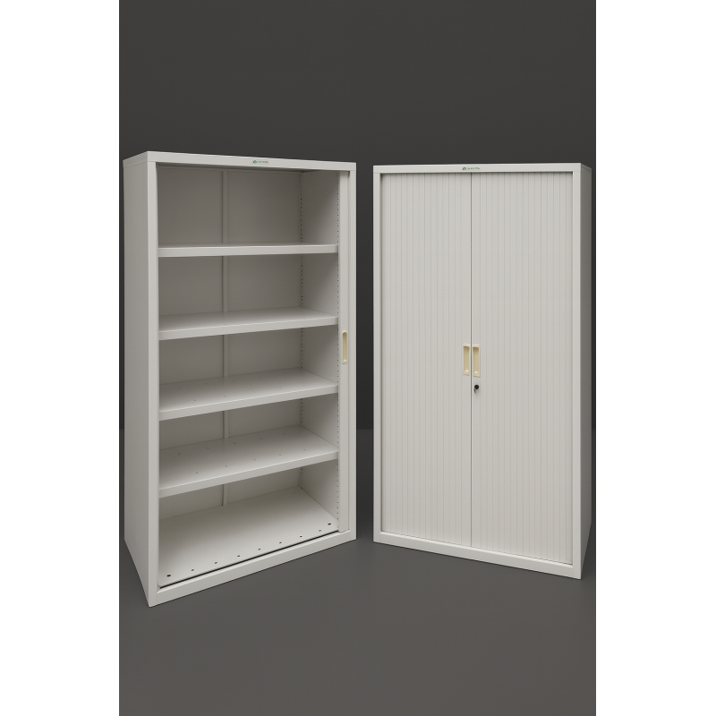 The Firstline Tambour cabinet is cleanly designed with slatted tambour doors that retract into the side of the cabinet.