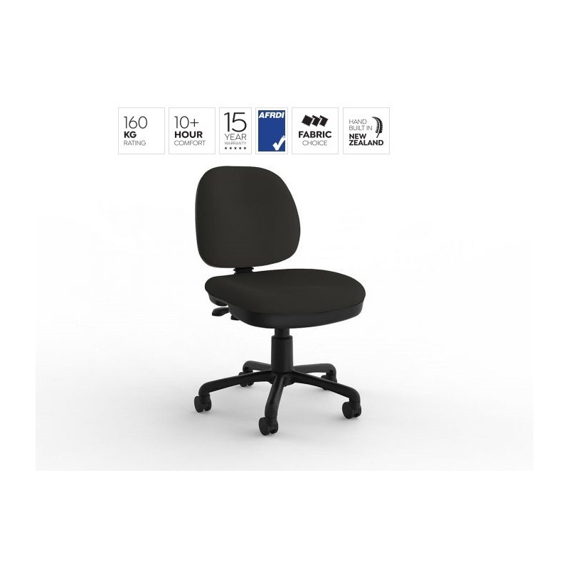 • Evo 3 midback chair with AFRDI Rating has molded high density seat and back cushion so you are comfortable all day, pronounced lumbar support, and extra strong black nylon star base. Gas lift has a lifetime warranty. Upholstered in your choice of Crown, Breathe or Splice fabrics, or black PU.